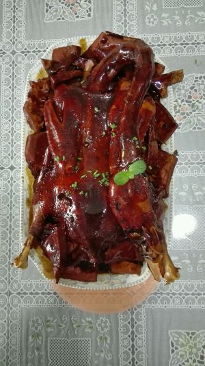最后放入冰糖上色,大火收汁(也可将鸭子香干盛出,用生粉勾芡收汁后酱汁淋在鸭子上等)撒上葱花。