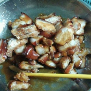提前一天买好猪肉,去皮切成3-4cm厚的长条,用盐跟生抽腌制一个小时后洗去,再用叉烧酱将猪肉涂抹均匀后放入冰箱冷藏。