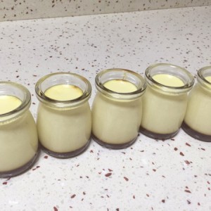 焦糖趁热倒入布丁瓶里,动作慢了会冻住,万一冻住了再加热一下就可以了,这个是六个奶瓶的分量