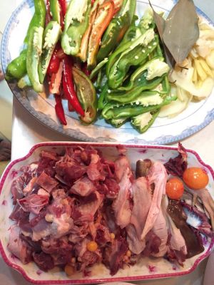 先将鸭子切好,辣椒切好
