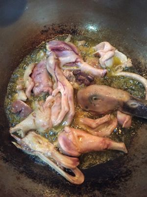 菜籽油烧热,鸭子翻炒放盐