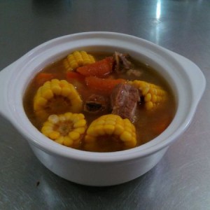 准备食材,排骨泡出血水,胡萝卜切菱形块,玉米切段,生姜和大葱忘了拍了!