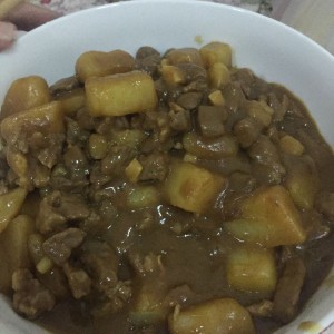 加入油咖喱块,少许盐,翻炒至土豆均匀,然后加入牛肉,倒入1罐椰汁,小火炖10分钟即可,关火后再焖5的分钟,就搞定了。