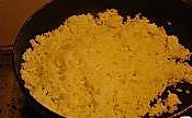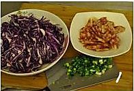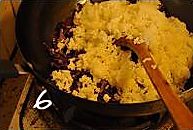 加入炒散的剩米饭粒,中火拌炒,让每粒米饭吸收紫包菜的甜,腊肠的香,即可。