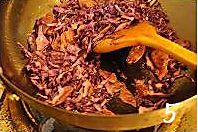下油热锅,炒香腊肠,放入紫包菜丝,翻炒至断生,加点点盐,适量的生抽,搅拌均匀。
