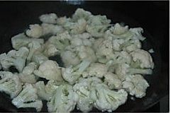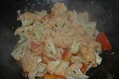 倒入花菜翻炒,加入盐,糖,少许番茄酱翻炒后起锅