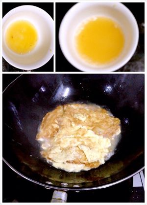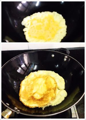 油倒入锅中烧热,倒入蛋液煎至双面成型。