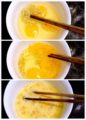 鸡蛋磕进碗里放入姜末,用筷子顺时针全部打散。