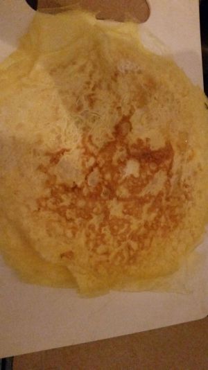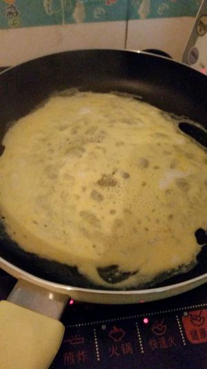 加入5g食用油,均匀涂抹在锅上,小火加热,倒入适量鸡蛋液刚好没过锅底,小火煎1-2分钟,起锅摊凉备用。