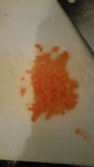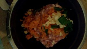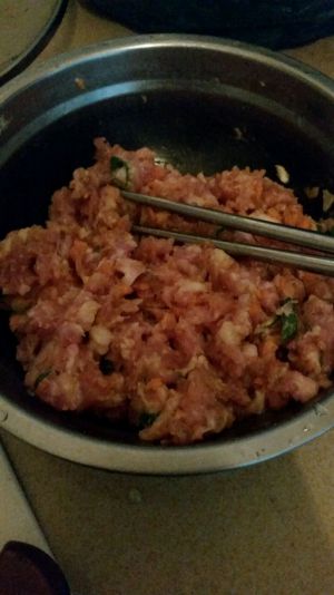 将五花肉绞碎,放入蒜末,胡萝卜,葱花,加入少许鸡粉,盐,淀粉和酱油,淀粉用来凝结肉末。