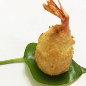将土豆裹在虾肉外面,把虾尾竖起来。