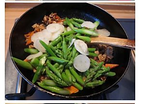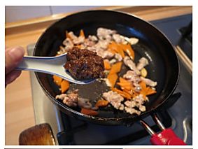 加入胡萝卜片略炒后,加入2汤匙豆瓣酱一起翻炒;