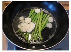 锅中放水烧开加少许油和盐,放入芦笋和马蹄一起水里略煮后倒出过冷水备用;