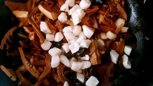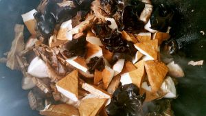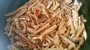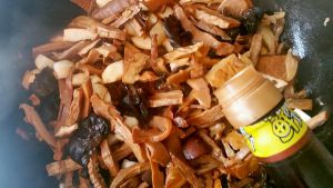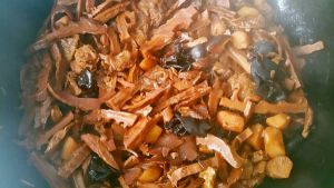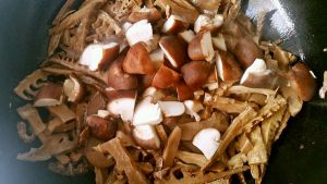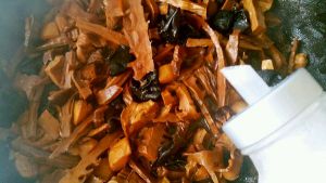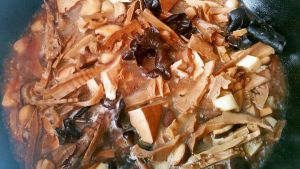 起油锅,加入笋干煸炒,一定要多煸炒一会儿