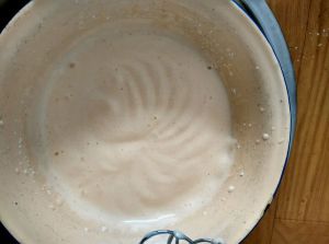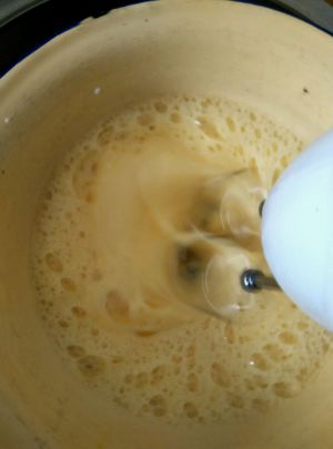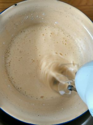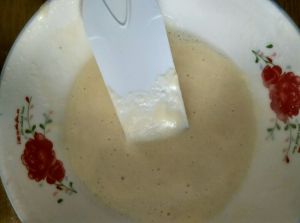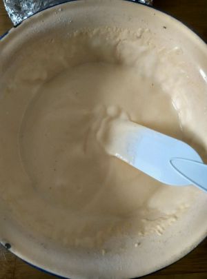 少量的蛋糕糊顺着盆边缘倒进蛋糊里 ,要边倒边拌匀