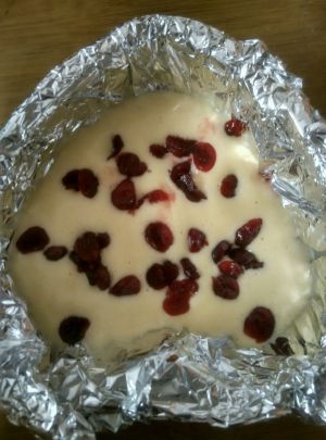 倒进剩余的的蛋糕糊并撒上蔓越莓,镇出气泡
