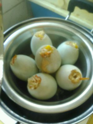 接着呢把鸭蛋用剪刀戳一小洞,倒出所有蛋白,再用小勺子把刚刚静置的食材装进蛋里