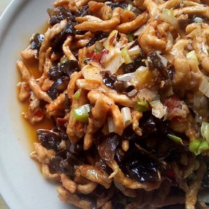 用开水泡发干木耳,然后把里脊肉切丝,加一勺豆瓣酱、一点生抽和一点豌豆粉,抓匀,然后再准备其他材料,等肉腌起。