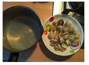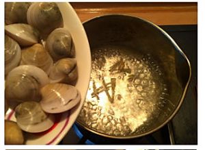 小锅中放少许水,切几段姜丝大火煮开后放入蛤蜊煮至壳微微张开,捞出蛤蜊;
