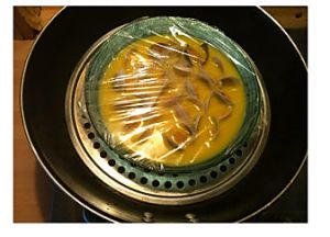 取1深盘,铺上蛤蜊,倒入蛋液,盖一层保鲜膜(也可用相同尺寸的另一个盘子压在蒸蛋的盘子上,防止水汽进入)入开水锅中中火蒸8-10分钟至蛋液凝固,取出洒葱花及香油即可。