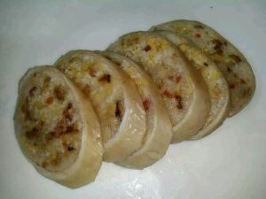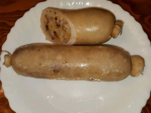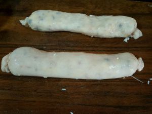 猪大肠洗干净用线扎好一头酿去糯米,注意不能装大多糯米,有松动位!