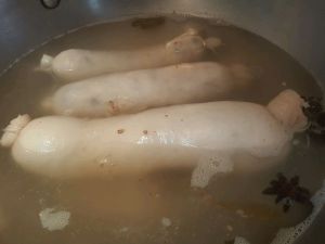 酿好的猪大肠出水(飞水),锅放水淹过糯米肠!加入20粒拍碎的胡椒粒,香叶,八角,盐,鸡粉,大火烧开转中小火盖住焖煮一个小时,中途打开转位!