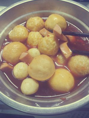 熟了之后,先拿一点来吃。然后放年糕,放面条,放蔬菜。【家里没蔬菜而吃到腻的我放不了照片(๑•ั็ω•็ั๑)】