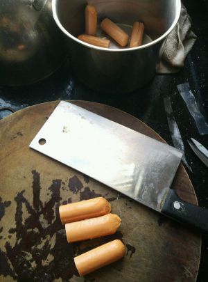 这个期间我们来切火腿肠,把火腿肠切半,之后竖着切一个十字