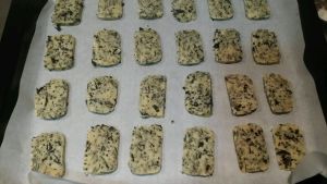 切成0.4cm d的面片,摆在烤盘上。放入预热至180度的烤箱中层,上下火,烤16分钟左右,直至饼干变成金黄色。