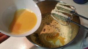 100g黄油软化后加入10g细砂糖,4g的盐打匀,再分3次加入打散的鸡蛋,每次都要搅打到蛋液和黄油混合物完全融合再加蛋液。