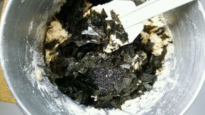 再倒入黑芝麻和切碎的海苔。