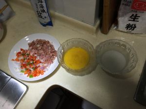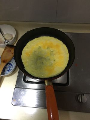 将锅洗净放油,之前打好的鸡蛋液加入水淀粉拌匀平铺倒入平底锅中,煎成蛋饼。