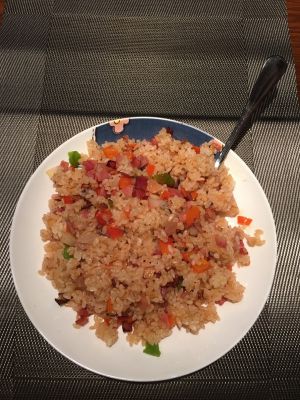 热锅加油放入青椒红椒洋葱煸炒,再加入培根炒,最后加入米饭,番茄酱一起炒。