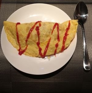 将炒饭倒在蛋皮中央,卷边压实,在蛋皮表面撒上一点番茄酱,又好吃又好看,大功告成!