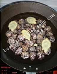 锅内加凉水、麻蛤和姜片,大火煮至麻蛤开口后捞出。