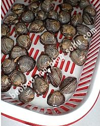 麻蛤用淡盐水浸泡使之吐净泥沙,并用刷子刷净外壳。