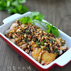 把姜末、葱花、蒜末、白糖、芝麻酱、香醋、生抽和炒香的白芝麻和花生碎全部放入一个小碗中,拌匀后再放入步骤7的辣椒油拌匀。鸡从冰水中取出切件,淋上调好的调味汁即可。