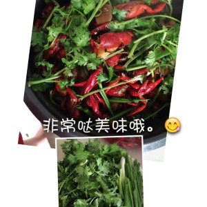 出锅时,放少许葱段和香菜放入碗下面,先把配菜乘出,接着把所有烧好哒美味哒虾子乘出。并在龙虾上搭配适量的香菜和葱段。这道美味哒油焖大虾就做好啦。