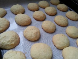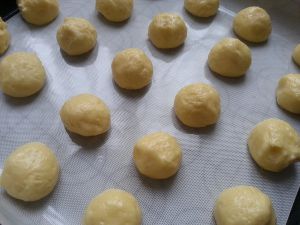 把翻拌好的奶酪面糊用小勺挖取大小合适的面团轻轻滚圆放入有烘焙纸的烤盘中,不要大力揉搓面团,会影响成品的松软,滚圆的面球相互之间要留空隙,以免烘烤的过程中涨大而粘到一起
