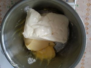 把软化的黄油和奶酪放一起加入白糖搅拌,是搅拌不用打发哦!