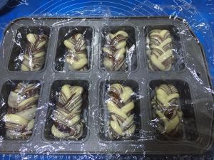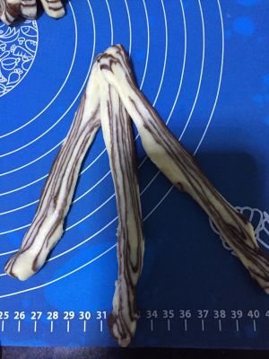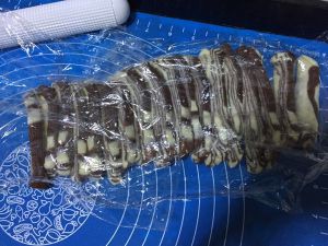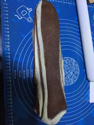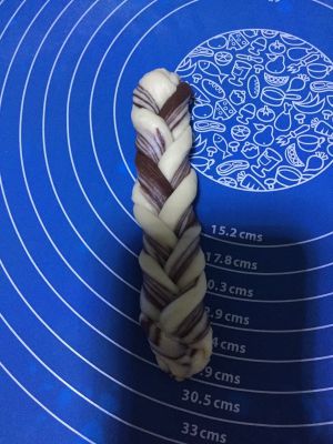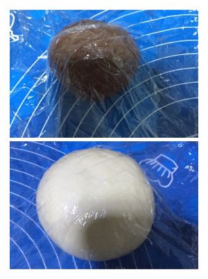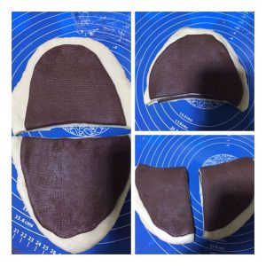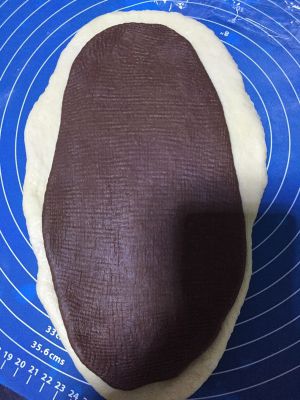 将原味面团擀成20✖️15cm,可可面团擀成18✖️12cm,将可可面团至于原味面团之上。