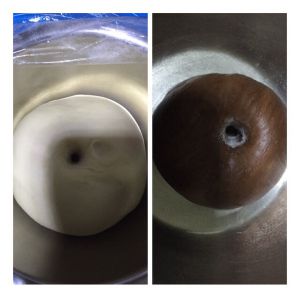 将2个面团盖保鲜膜送入温暖处进行基础发酵。用手指沾高筋面粉插入面团,小洞不回缩,面团不塌陷,即可说明基础发酵结束。
