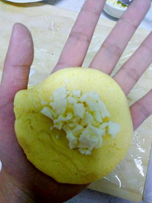 揪成小剂子,用手按成圆形,如果面太稀了粘手可以在手上抹一些油,然后将马苏里拉芝士包在面中