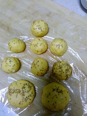 做好的芝士球沾上白芝麻,等待下锅