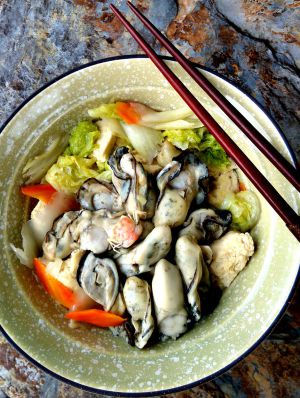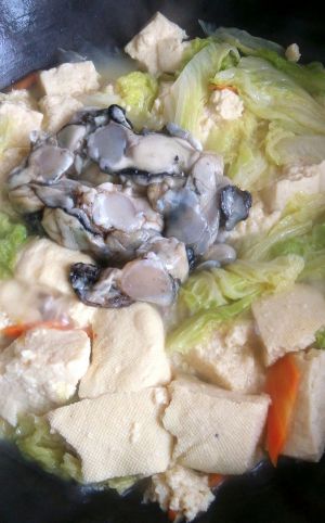 菜叶八成熟时,把洗净的牡蛎放在上面,盖上锅盖,小火焖到牡蛎熟了即可