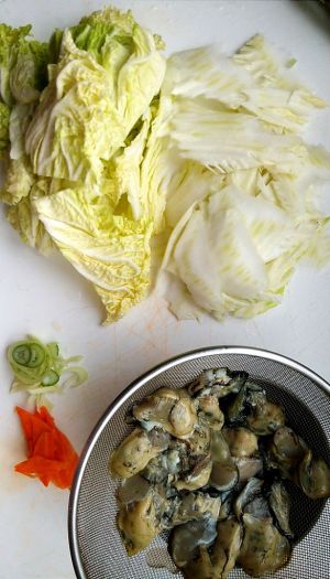 切葱花儿,胡萝卜片,牡蛎用清水冲洗干净,沥净水份备用