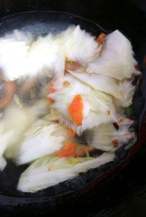 菜帮七八成熟时,加入菜叶,继续小火炖