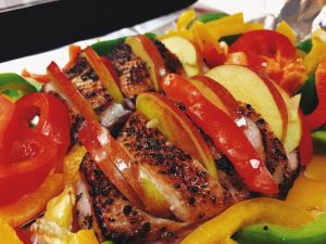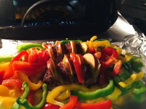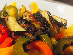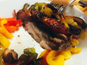 烤制的时候,彩椒吸收了鸭肉的油脂,漂亮地出炉~因为有蜂蜜,所以鸭皮略微发焦~