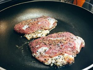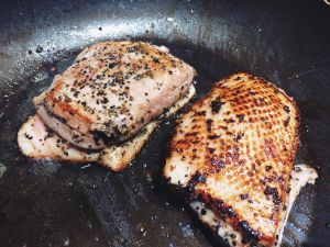 锅烧热,无需黄油,鸭皮这一面下锅,小火煸出油脂,慢慢煎