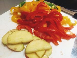 等鸭胸变凉的时间里将彩椒与苹果改刀